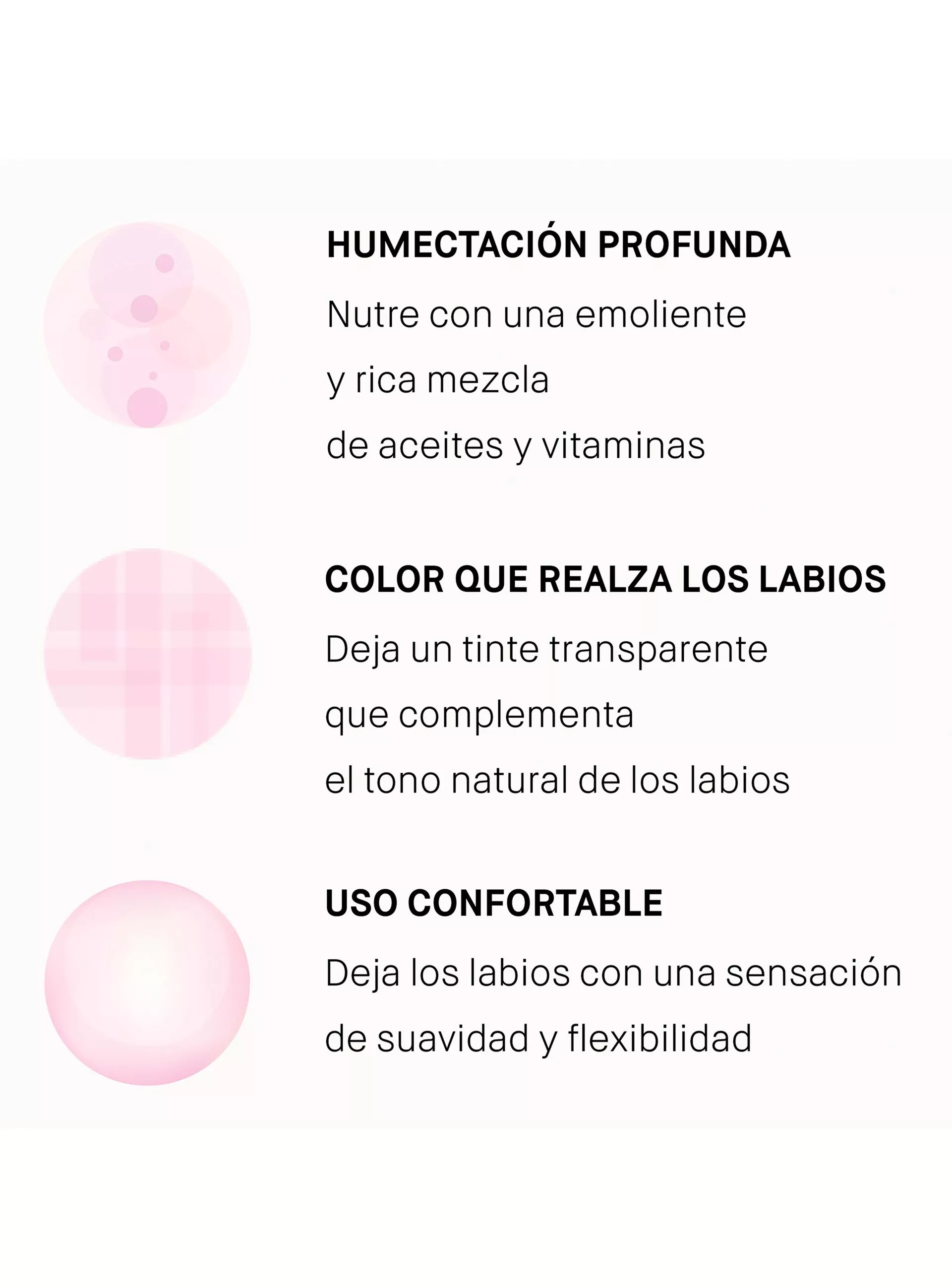 Desde la primera aplicación, los labios se sienten más hidratados, suaves y con un brillo saludable. Con el uso continuo, mejora la apariencia de resequedad y líneas finas, dejando un aspecto más uniforme y natural. El color se adapta sutilmente al tono del labio, logrando un efecto favorecedor sin esfuerzo.